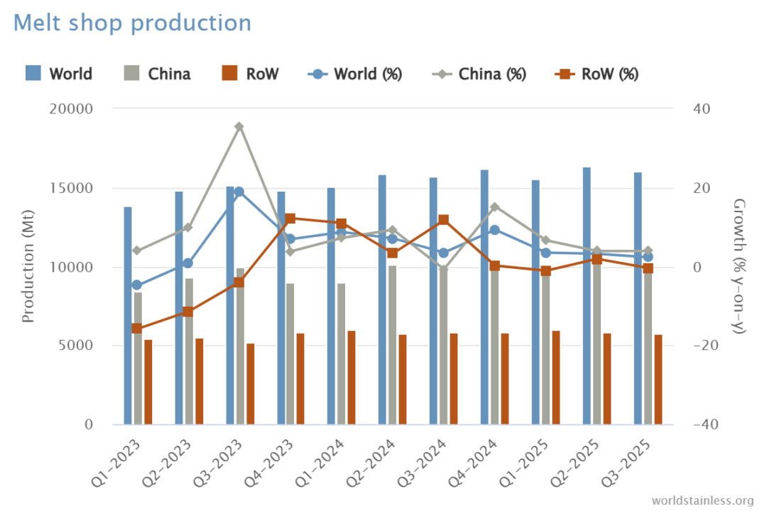 世界鋼鐵協(xié)會(huì)下屬不銹鋼分會(huì)發(fā)布的2025年第三季度的數(shù)據(jù)表明,前九個(gè)月全球不銹鋼粗鋼產(chǎn)量為4800萬(wàn)噸,同比提高3.0%。